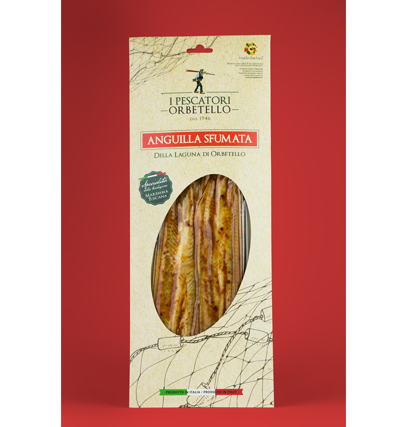 ANGUILLA SFUMATALe anguille sono pescate esclusivamente in laguna con metodi tradizionali e utilizzando nasse e trappole. Lavorate a mano, dopo la marinatura le anguille vengono sfumate con fumo naturale per poi essere condite secondo la ricetta tradizionale: pomodoro, peperoncino, olio extravergine di oliva, aceto di vino e sale.