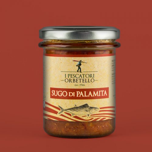 Sugo con base di pomodoro, cucinato esclusivamente con polpa di cefalo pescato nella Laguna di Orbetello, arricchito con olive nere, capperi e prezzemolo, in vaso da 180g.